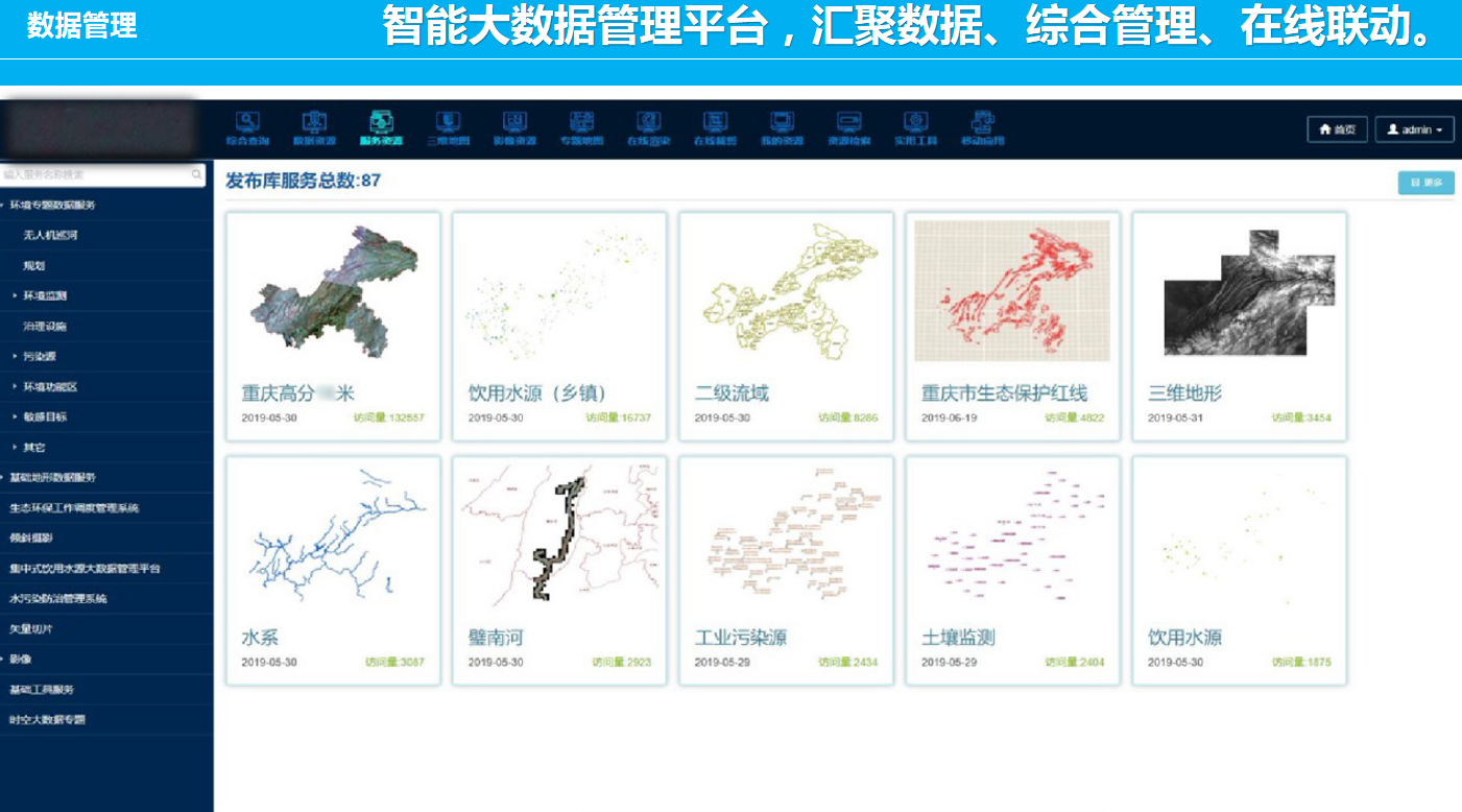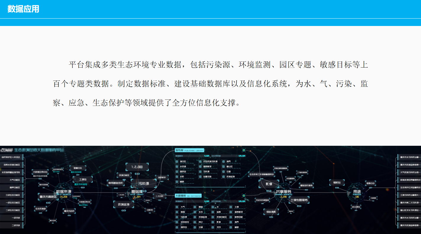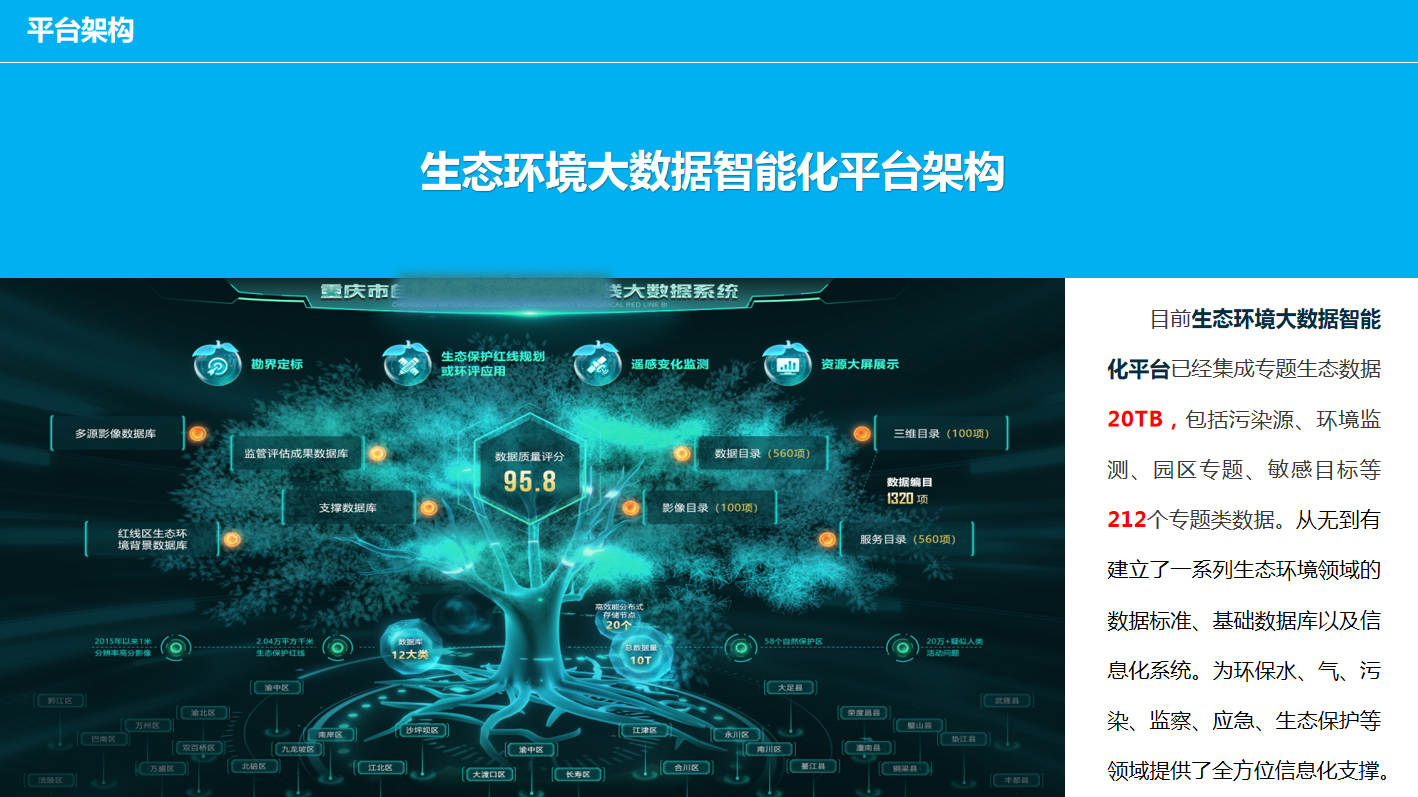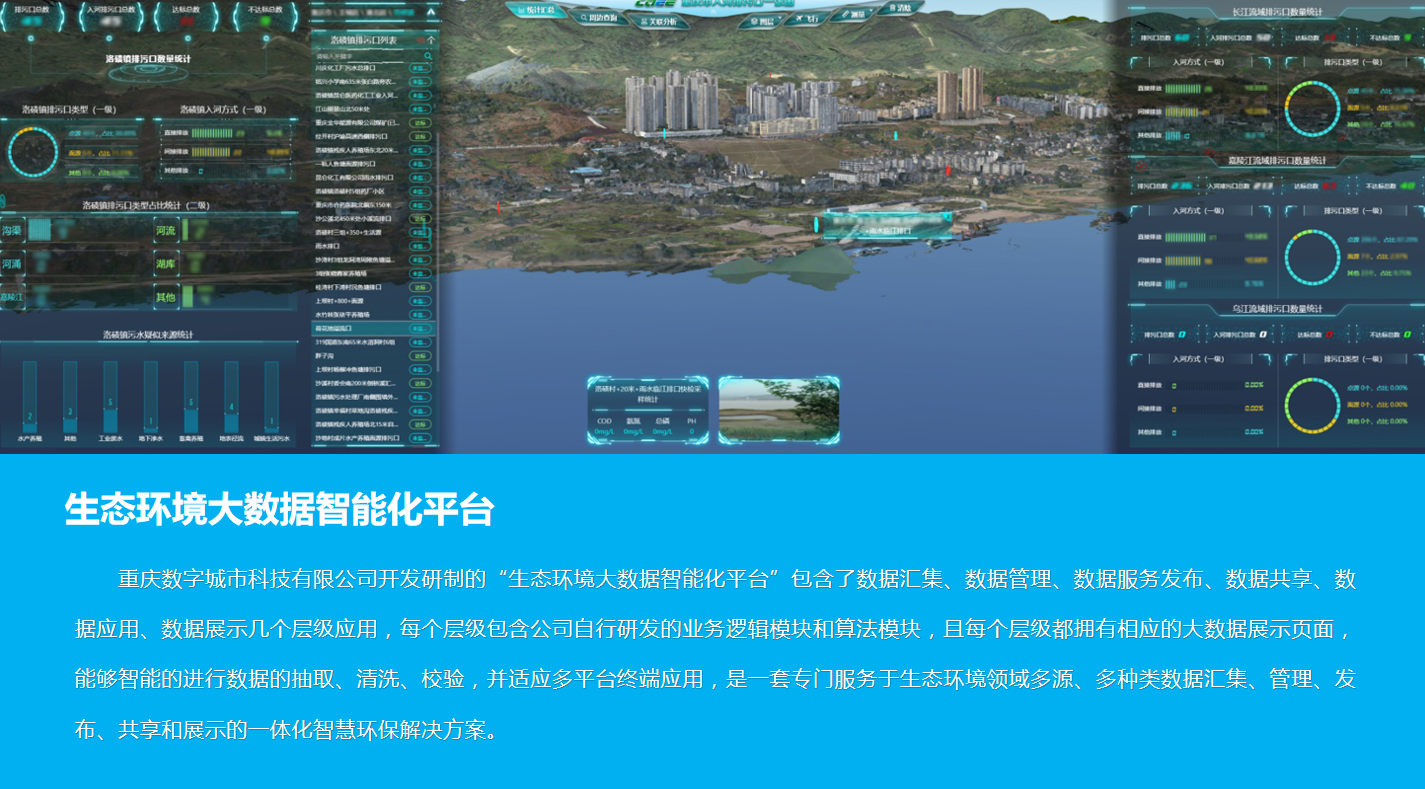重慶數(shù)字城市科技有限公司開發(fā)研制的“生態(tài)環(huán)境大數(shù)據(jù)智能化平臺(tái)”包含了數(shù)據(jù)匯集、數(shù)據(jù)管理、數(shù)據(jù)服務(wù)發(fā)布、數(shù)據(jù)共享、數(shù)據(jù)應(yīng)用、數(shù)據(jù)展示幾個(gè)層級(jí)應(yīng)用,每個(gè)層級(jí)包含公司自行研發(fā)的業(yè)務(wù)邏輯模塊和算法模塊,且每個(gè)層級(jí)都擁有相應(yīng)的大數(shù)據(jù)展示頁面,能夠智能的進(jìn)行數(shù)據(jù)的抽取、清洗、校驗(yàn),并適應(yīng)多平臺(tái)終端應(yīng)用,是一套專門服務(wù)于生態(tài)環(huán)境領(lǐng)域多源、多種類數(shù)據(jù)匯集、管理、發(fā)布、共享和展示的一體化智慧環(huán)保解決方案。