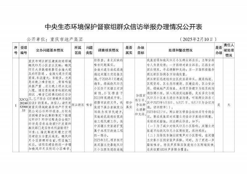 根據(jù)《關(guān)于加強(qiáng)中央生態(tài)環(huán)境保護(hù)督察交辦群眾舉報(bào)件辦理工作的通知》(渝環(huán)督辦發(fā)〔2024〕13號(hào))要求,群眾舉報(bào)件辦結(jié)驗(yàn)收后,各整改責(zé)任單位應(yīng)填寫(xiě)舉報(bào)辦理情況公開(kāi)表,在區(qū)縣、市級(jí)部門(mén)或市屬?lài)?guó)有重點(diǎn)企業(yè)門(mén)戶(hù)網(wǎng)站上對(duì)外公示群眾舉報(bào)件辦理情況,接受社會(huì)和群眾監(jiān)督,公示期應(yīng)不少于10個(gè)工作日。現(xiàn)按照生態(tài)環(huán)保督察相關(guān)要求對(duì)受理編號(hào)X3CQ202405290033群眾舉報(bào)辦理情況公開(kāi)表對(duì)外公示,公示時(shí)間為2025年2月14日-2025年2月27日,聯(lián)系電話(huà):63629733。
